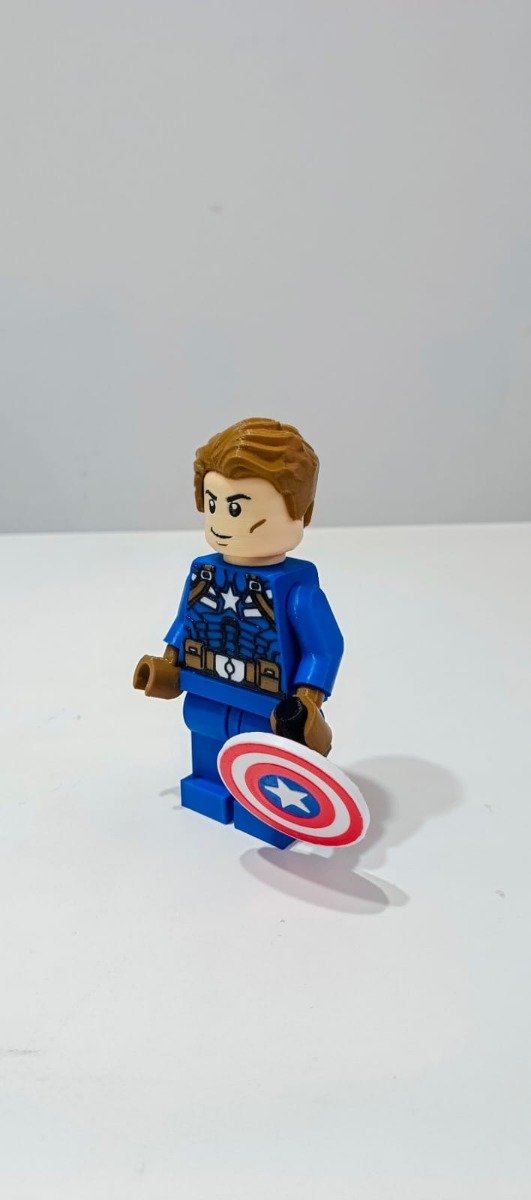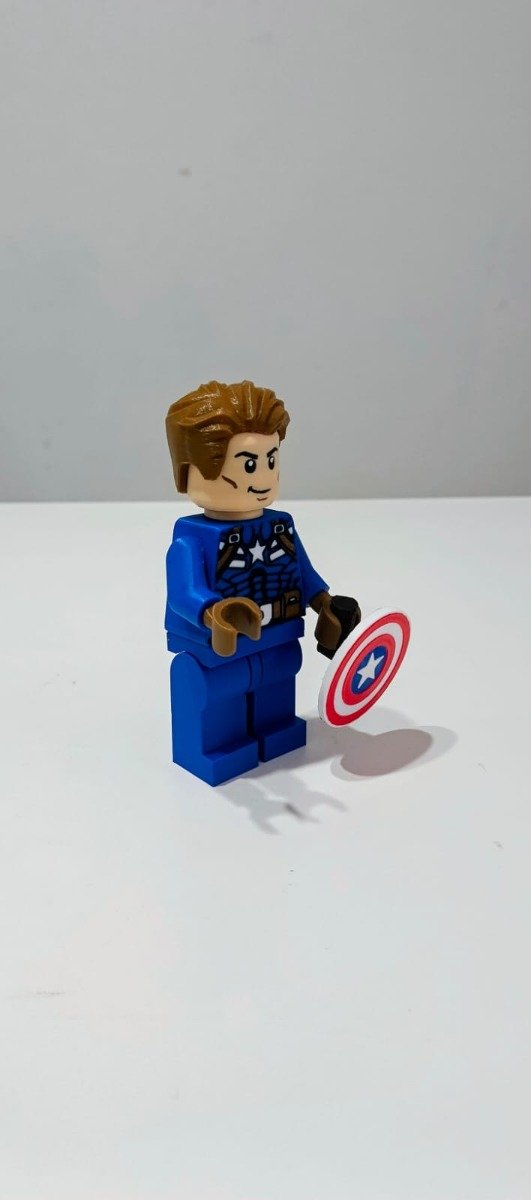 Esta pieza captura fielmente el estilo adorable y blocky de las minifiguras Lego: cabeza sobredimensionada con cabello rubio, torso azul con estrella blanca, escudo vibrante y la expresión heroica del supersoldado.